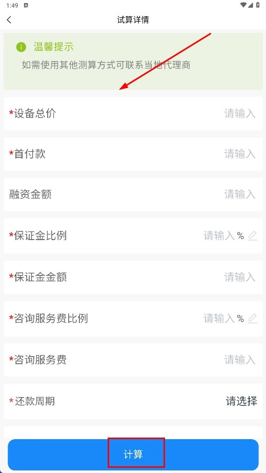 3、在试算详情页面输入设备总价、首付款等信息后,点击【计算-功能按钮】。