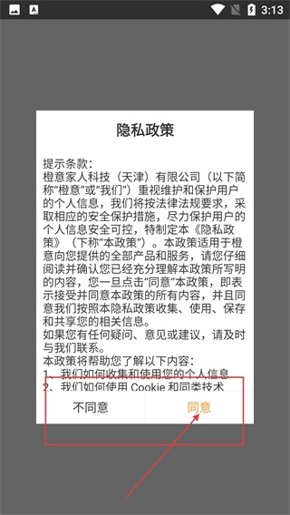 1、在橙意相关应用启动时,您需要先阅读隐私政策,之后点击“同意”按钮,以此确认接受该政策,方可继续使用应用。