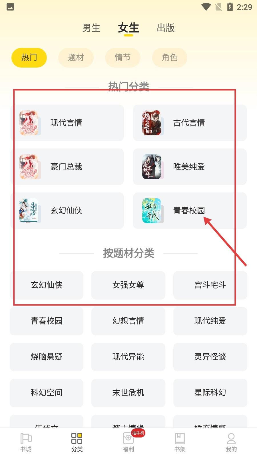 1、在分类页面的热门分类区域,点击【青春校园】分类选项,即可进入青春校园小说的列表页面。