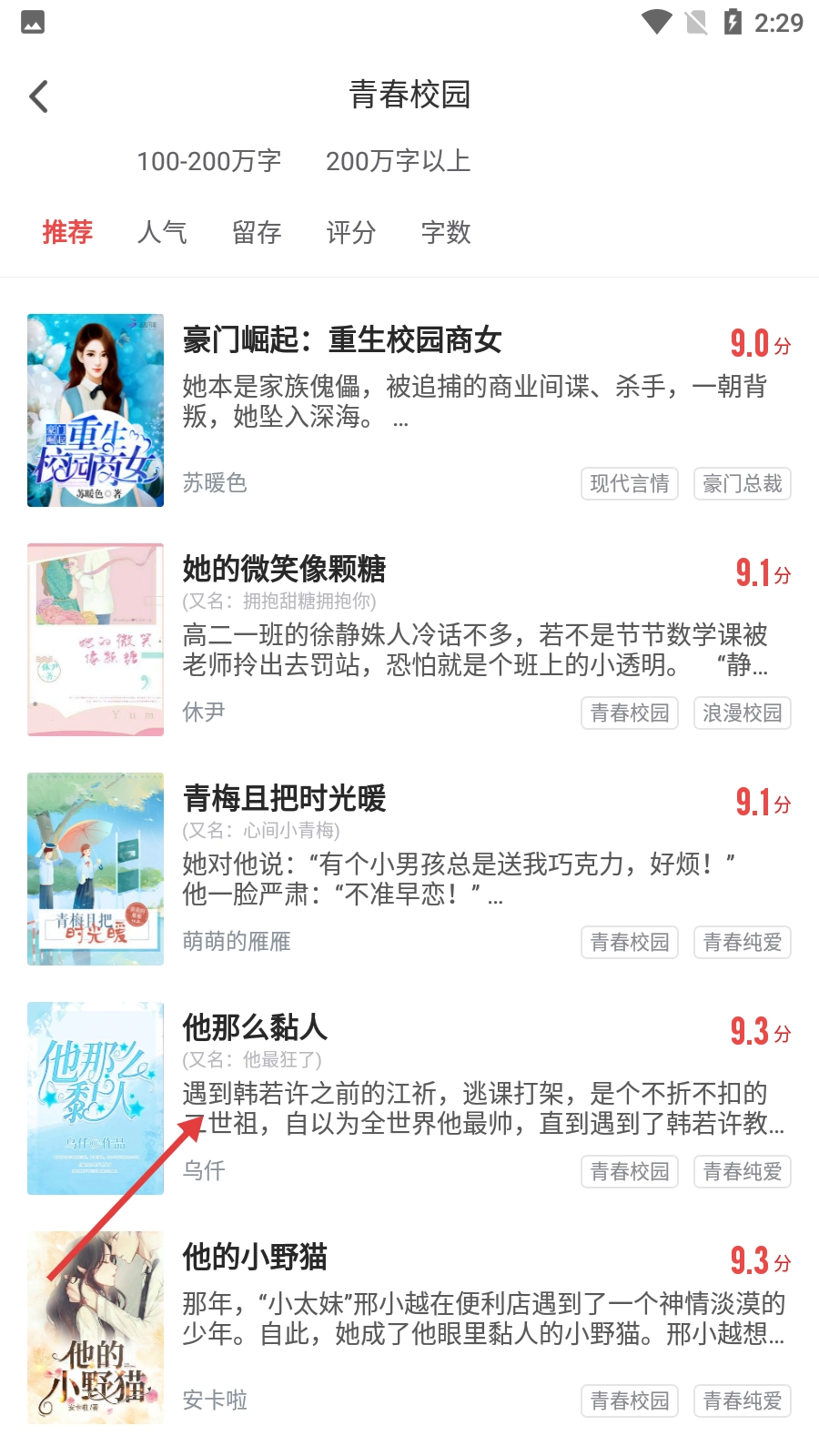 2、在青春校园小说列表中,比如:点击【他那么黏人】,进入该小说详情页。