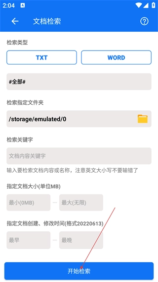 3、在文档检索页面,选择检索类型(如【TXT】),设置路径、关键字等条件后点【开始检索】。