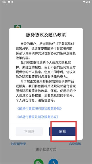 阅读《服务协议及隐私政策》后,点击【同意】按钮,即可进入登录页面。
