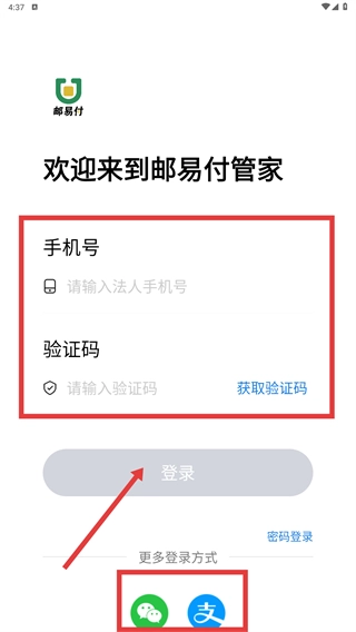 3、也可选择验证码登录:输入法人手机号,获取并填写验证码后,点击【登录-按钮】;还可通过微信、支付宝等第三方方式登录。