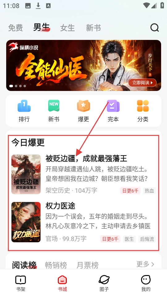 1、进入书城,在【今日爆更】板块找到感兴趣的小说,比如《被贬边疆,成就最强藩王》,点击进入阅读吧。