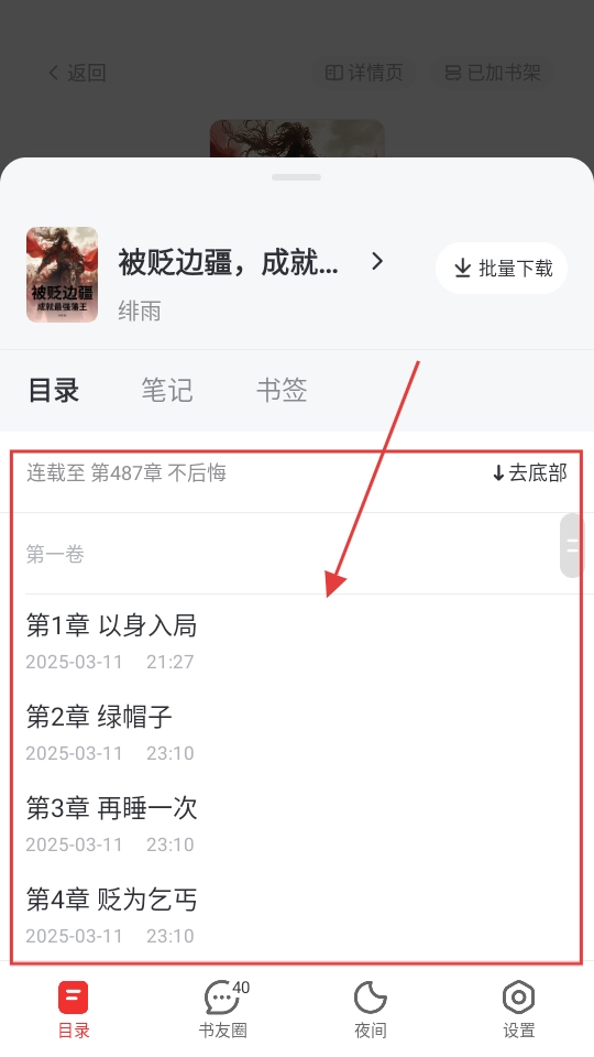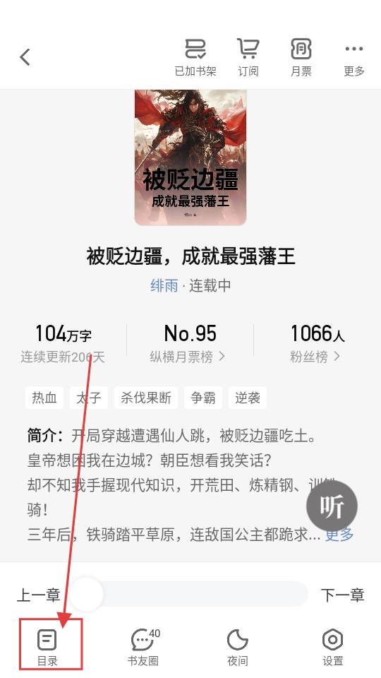 2、在小说详情页,点击左下角【目录】按钮,可查看小说的章节列表,方便选择章节阅读哦。