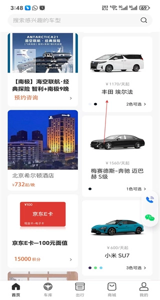4、返回首页点击车库按钮,浏览各类车型及套餐信息,选择感兴趣的车型查看其详细内容。