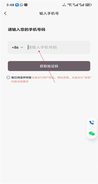 3、进入输入手机号页面,输入手机号码,勾选相关协议内容后,点击获取验证码的按钮。