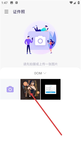 1、打开【证件照】界面,从【DCIM】文件夹里挑选要处理的图片,完成初始素材的选择,为接下来制作证件照做好准备。