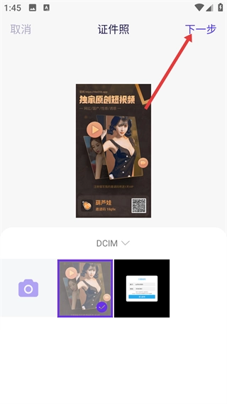 2、选定图片后,点击页面右上角的【下一步】按钮,进入证件照的编辑与规格选择环节,推进制作流程。