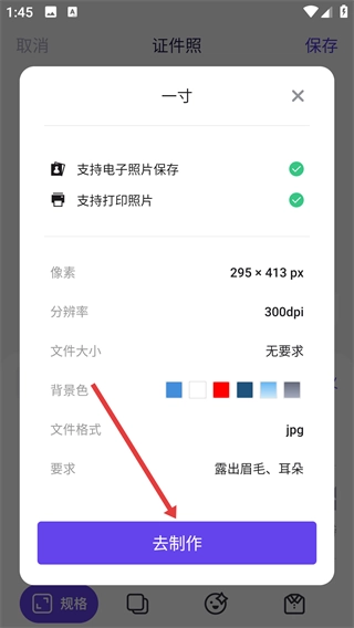 4、确认【一寸】证件照的参数(如295×413-px像素)后,点击【去制作】按钮,启动证件照的生成流程。