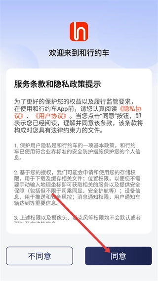 1、仔细阅读弹窗里的《隐私协议》与《用户协议》内容,点击【同意】按钮,即可完成协议确认并进入和行约车主界面。