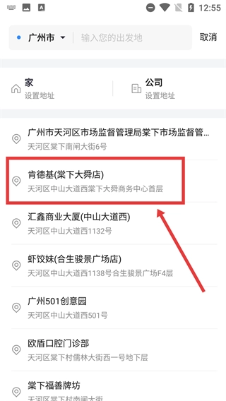 3、从地址列表中选择目标地点(如“肯德基(棠下大舜店)”),完成目的地设置,即可推进后续约车流程。