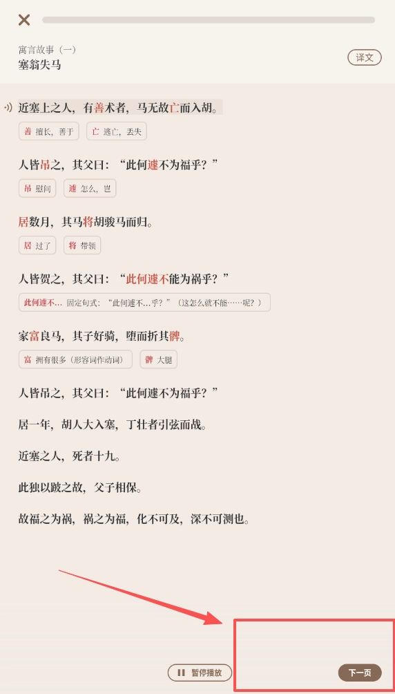 1、核心的自学功能允许使用者自由选择任意文言文进行深入学习,每篇文章都配备了原文注释翻译及背景介绍等多个维度的解读材料。