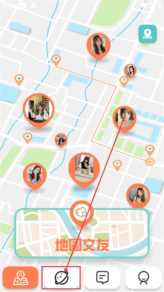 1、在【地图交友】界面点击底部的星球图标,即可进入动态大厅页面,浏览其他用户分享的内容。