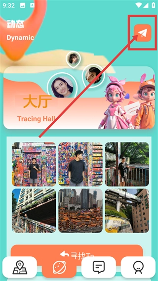 2、进入动态大厅后点击右上角的纸飞机按钮,就能打开动态发布编辑页,准备分享自己的内容哦。