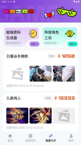2、在淘游估价页面,提交你的账号或者手办信息,就能得出结果。
