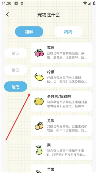 4、在同一页面切换至【能吃】分类,可查看猫咪适宜食用的食物及注意事项(如荔枝、梨等),辅助科学喂养。