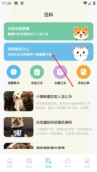 1、在宠物互动类应用的首页,点击底部的【百科】选项,就能进入包含宠物知识与工具的百科页面。