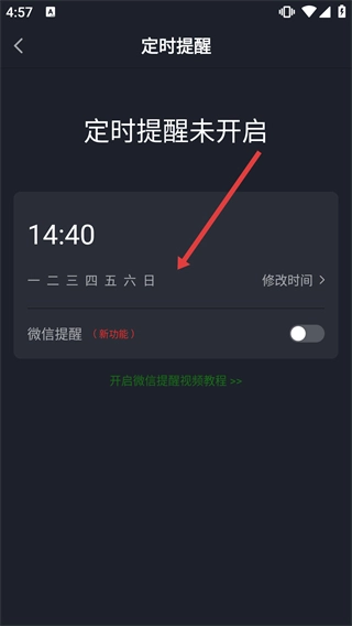 3、在【定时提醒】页面,看到“定时提醒未开启”提示,点击【修改时间】选项,进入时间与日期的调整界面。