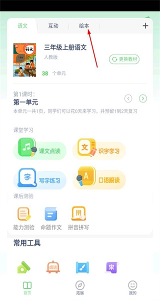 打开软件进入首页后,在显示有语文互动等标签的界面中,点击绘本标签即可切换至对应的内容页面。