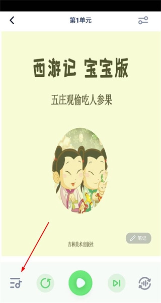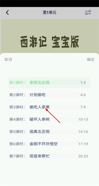 3、进入绘本阅读界面,看到西游记宝宝版的封面,点击底部对应按钮展开课时选择列表。