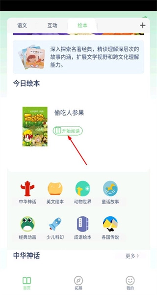 2、进入绘本页面,看到今日绘本板块下的偷吃人参保内容,点击开始阅读按钮进入绘本界面。