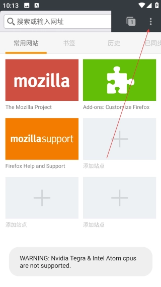 1、打开flashfox浏览器软件,在首页点击右上角的三点图标,即可打开功能操作菜单。