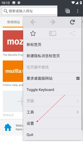 2、当弹出菜单后,选择【设置】选项并点击,即可进入浏览器的设置页面。