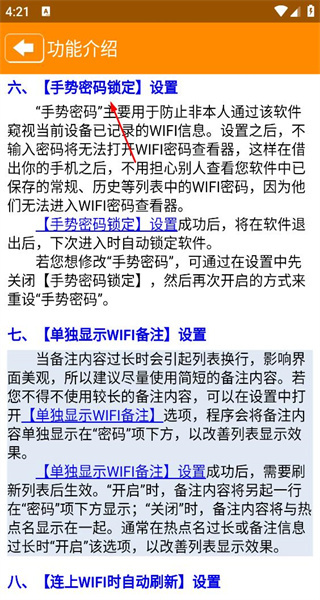 4、可前往功能介绍页面,了解手势密码锁定设置的作用及修改方法说明,以此保障WiFi信息安全。