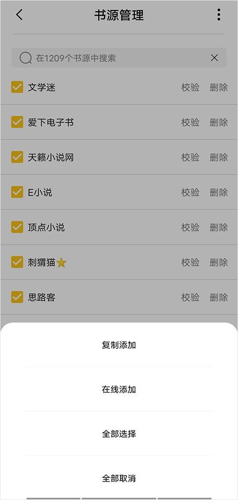 2、进入书源管理界面后,点击右上角的"..."菜单,选择适合的添加方式。