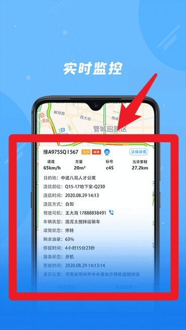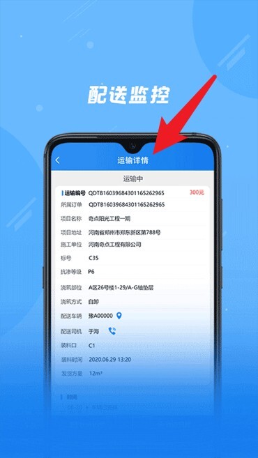 4、配货监控功能可查看运输单详情,涵盖项目名称、地址以及司机配送信息。