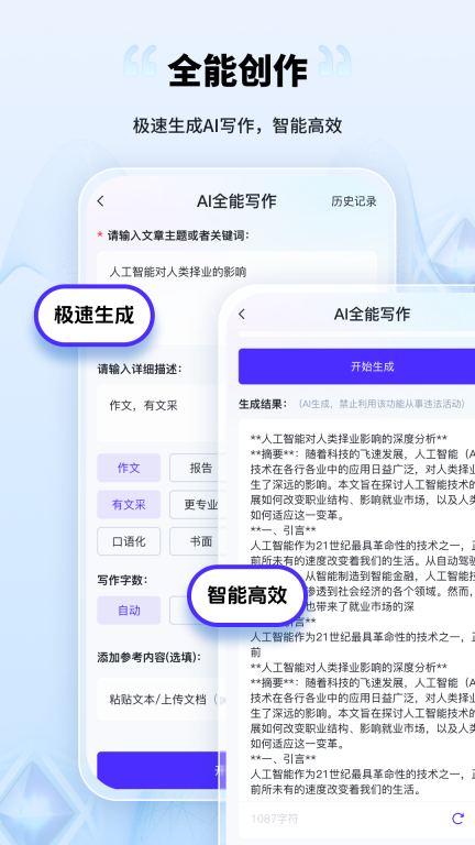 AI创作家拥有一系列实用的功能,能够满足用户的多种需求。智能写作功能让用户输入主题或关键词后,软件就会自动生成相关的文章或文案,大大简化了创作流程。文本纠错功能可以快速检查用户的文本并给出修改意见,保证内容的正确性。扩写功能允许用户在已有文本的基础上添加更多细节和信息,让内容更充实。续写功能帮助用户在写作时保持思路的连贯性,轻松延续未完成的段落。智能问答功能让用户能快速获取所需信息,提高工作效率。重写功能为用户提供多种表达方式,使同一内容可以用不同风格呈现,满足不同场景的需求。