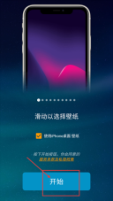 进入应用后,您可以滑动浏览并选择壁纸,勾选【使用iPhone桌面壁纸】选项后点击【开始】按钮,即表示您同意相关服务条款与隐私政策,并将进入后续流程。