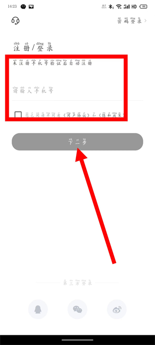 2、进入注册登录界面,填写手机号,勾选同意相关条款后,点击下一步按钮。
