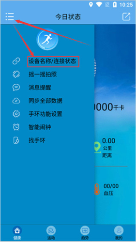 1、通过本站现在并打开fithere手环,进入首页后点击左上角的三横按钮,再选择“设备名称/连接状态”进入;