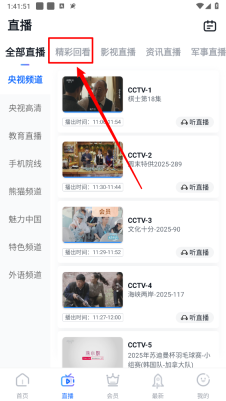 2、进入直播页面切换至"精彩回放"。