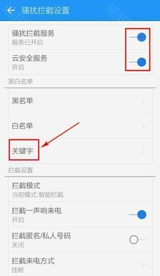 6、还可点击【关键词】设置拦截内容