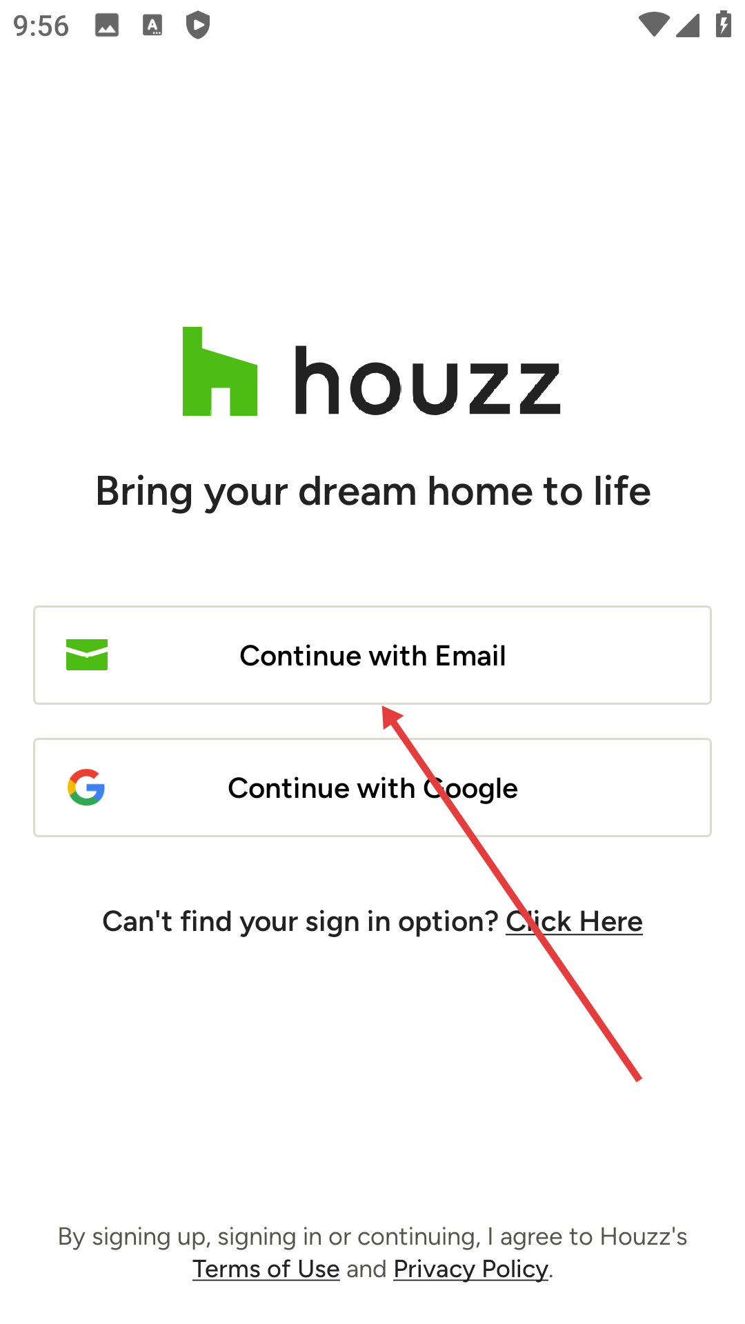 1、在Houzz登录界面点击【Continue-with-Email】按钮,进入邮箱输入页面。