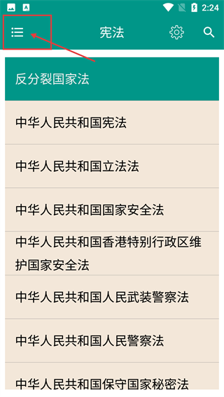 1、在法律类的宪法页面,点击左上角菜单按钮,展开法律分类列表。