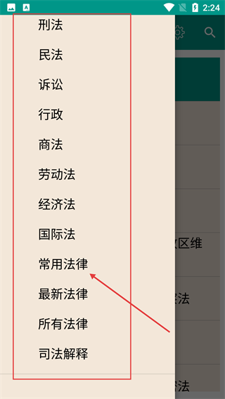 2、在法律分类列表中,点击“常用法律”选项,进入常用法律页面。