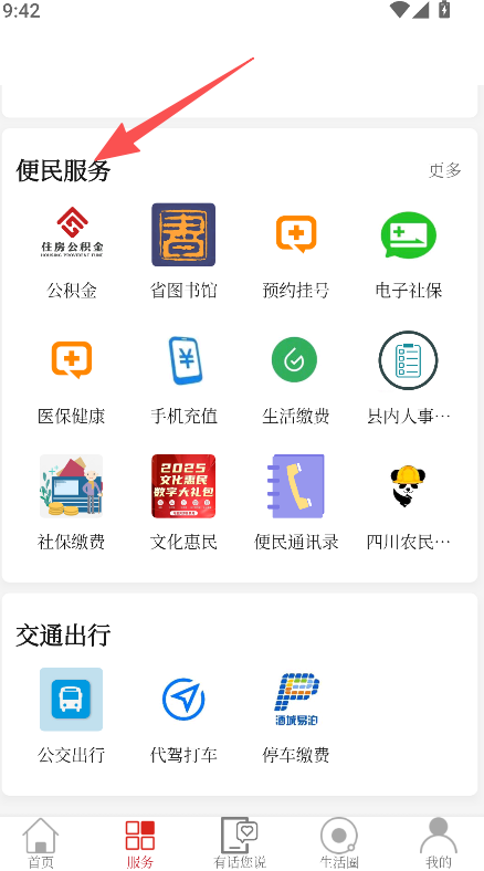 3、进入便民服务板块,选择公积金、预约挂号等功能使用。