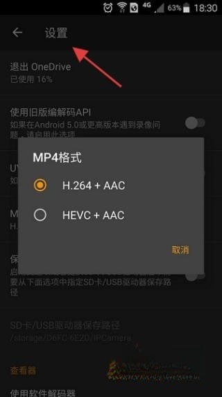 3、进入设置页面后,系统会弹出退出OneDrive的提示,此时界面会聚焦于MP4格式的选择项,用户可在H.264+AAC与HEVC+AAC这两种格式间切换,从而适配不同的存储需求。