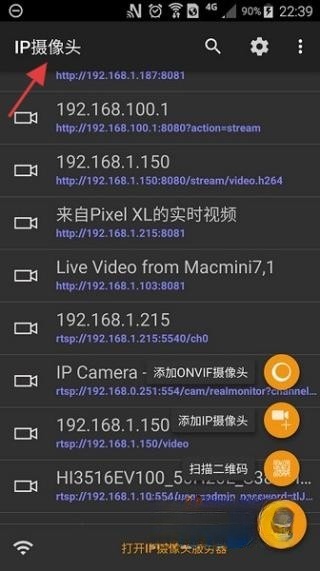2、点击进入IP摄像头地址列表页面,会展示多个IP地址及其对应的视频源,同时页面还提供添加摄像头等功能选项,方便用户对不同视频源进行有效管理。
