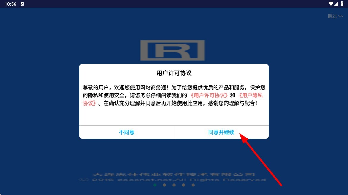 在用户许可协议页面,点击【同意并继续】功能按钮,即可进入应用介绍页面。