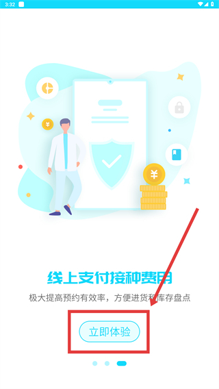1、点击【立即体验】按钮,进入该线上支付接种费用的服务平台,开启相关功能使用。
