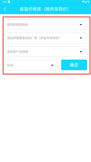 3、进入疫苗价格库页面后,请按顺序选择【疫苗种类】【厂家】【产品规格】【年份】,然后点击【确定】按钮,即可查询到对应的价格信息。