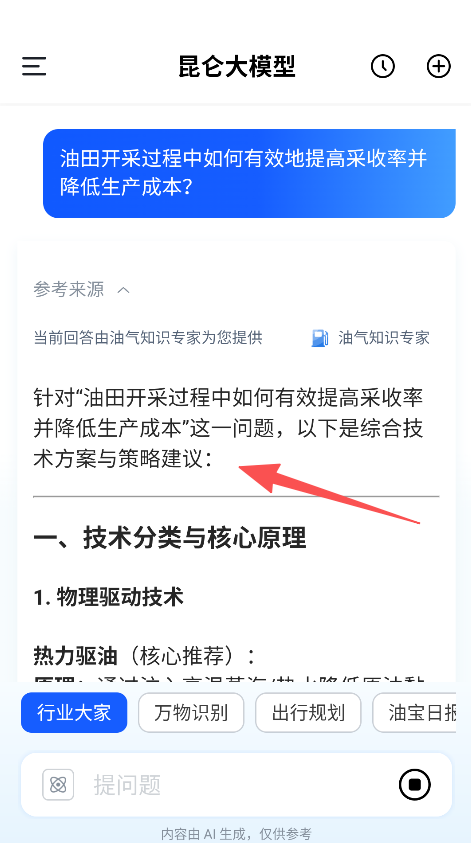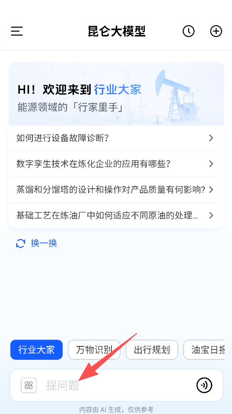 《昆仑大模型》作为能源领域的服务类软件,设有行业大家、万物识别、出行规划、油宝日报等多个板块。其中,行业大家板块不仅提供涵盖设备故障诊断、数字孪生技术应用等内容的能源相关预设问题,还支持用户输入自定义问题,以获取综合技术方案与策略建议;万物识别板块则具备拍照识别物体的功能,能够呈现识别结果及对应名称,覆盖了能源领域知识查询与物体识别的需求,既让能源相关的知识获取与物体识别过程更加便捷,也能满足能源场景下的各类信息需求,进而提升能源领域内容获取的高效性与适配性。