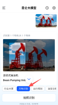 2、万物识别板块具备拍照识别能源相关物体的功能,可直接展示识别结果,能满足能源场景下的物体识别需求。