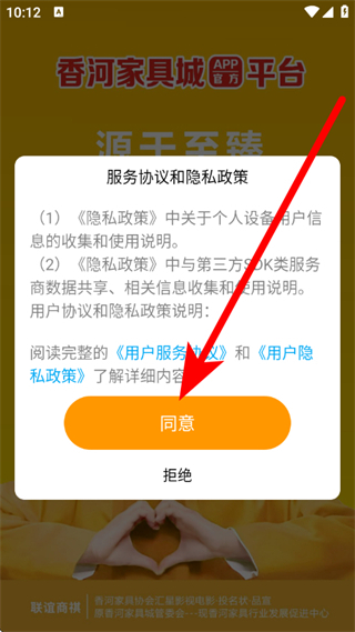 1、打开香河家具城,在服务协议弹窗中,点击同意。