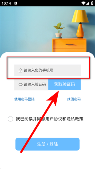3、在登录页面,输入手机号后,点击获取验证码。